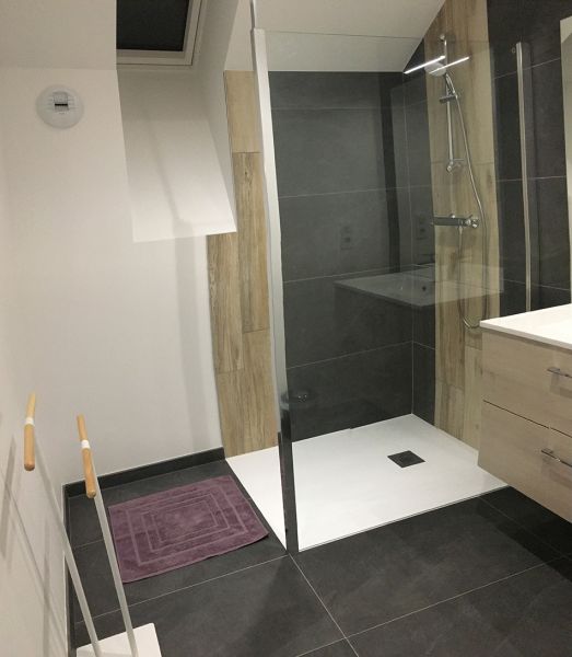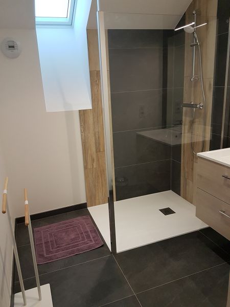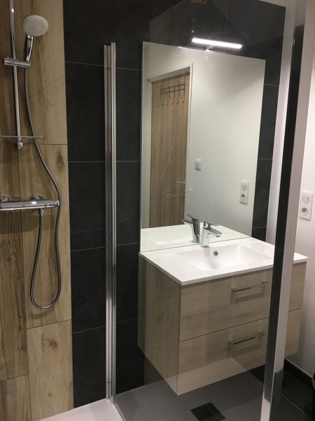 SDB avec douche, wc, lavabo et rangement + sèche-cheveux